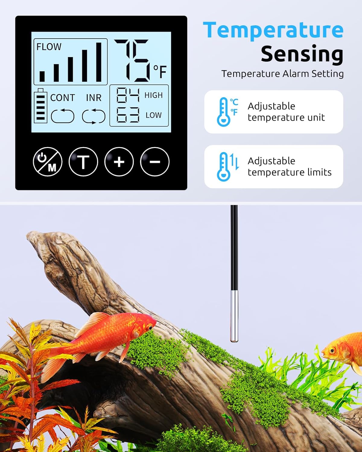 • Temperature Sensing with Smart Alerts: The Seaoura aquarium air pump features a temperature display and allows you to set upper and lower temperature limits. When the water temperature exceeds the set value, the pump automatically triggers an alarm to remind you to take action. You can also adjust the temperature units according to your preference for convenience and clarity.