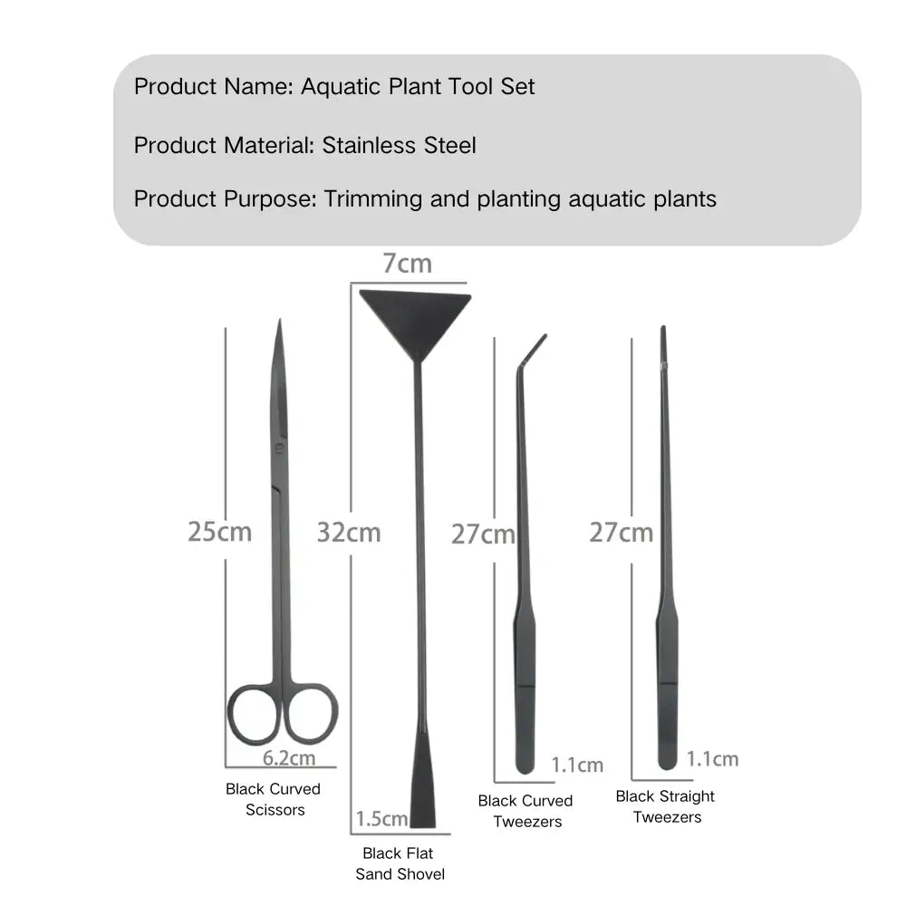 【4-in-1 Aquarium Tool Set】This set includes 1 25cm curved scissors, 1 32cm flat sand shovel, 1 27cm straight tweezers, and 1 27cm curved tweezers. It also comes with a durable velvety storage pouch for easy organization after use. Whether for aquarium beginners or seasoned hobbyists, this tool kit makes a thoughtful and practical gift.