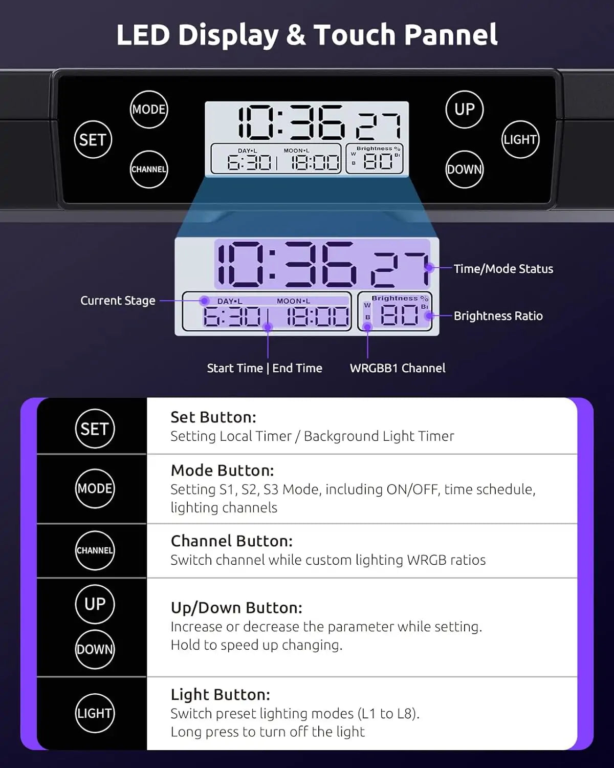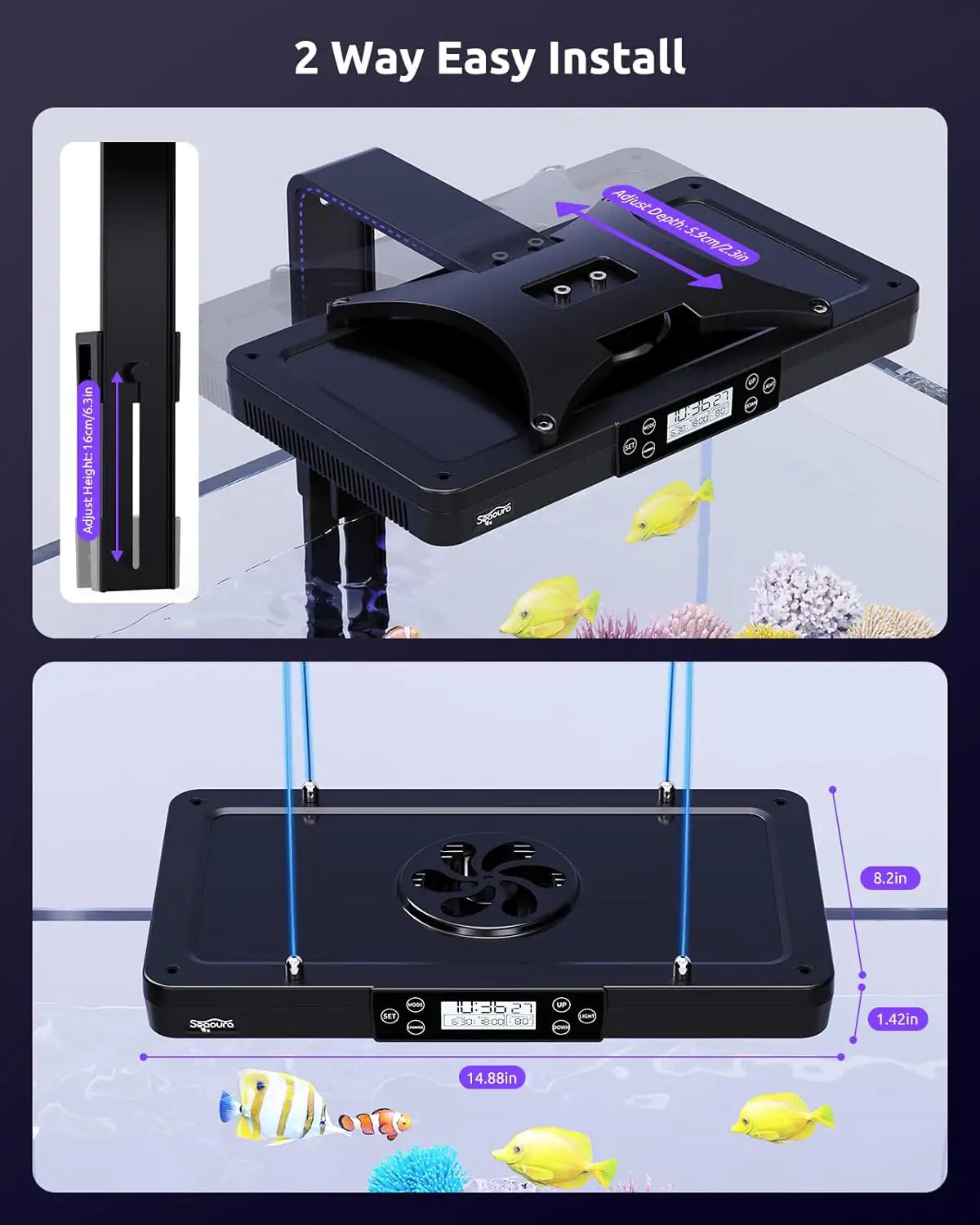 Smooth 15-minute light transitions (30 min in night mode) to prevent fish stress